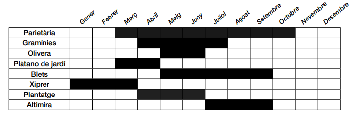 El calendari estacional simplificat per pòl·lens més prevalents a la nostra àrea us pot servir d’ajuda: